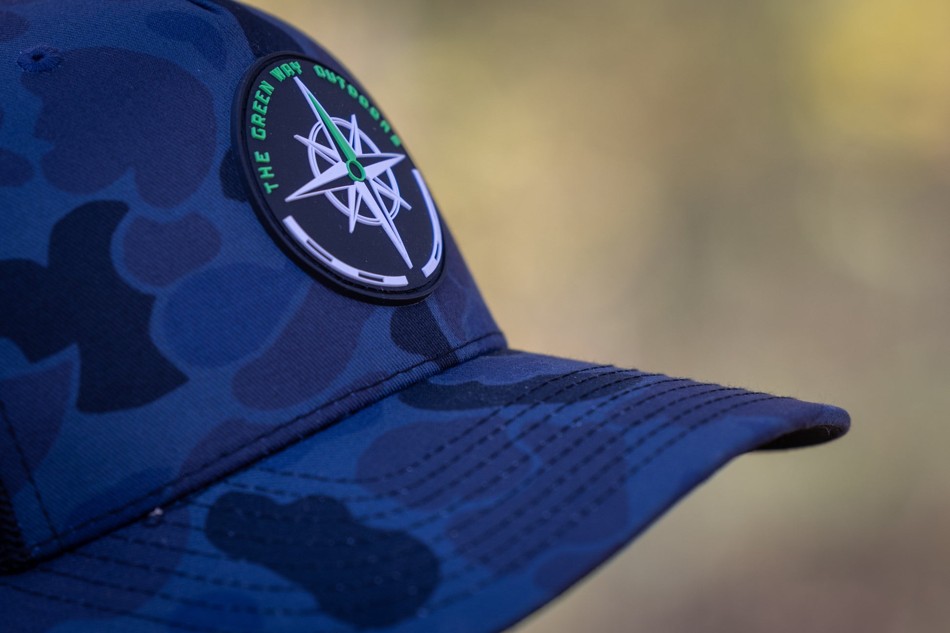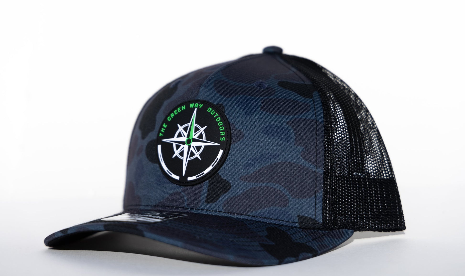 Classic trucker cap style built with a 5-panel pinch front construction in a black and blue came pattern featuring a TGWO rubber patch.