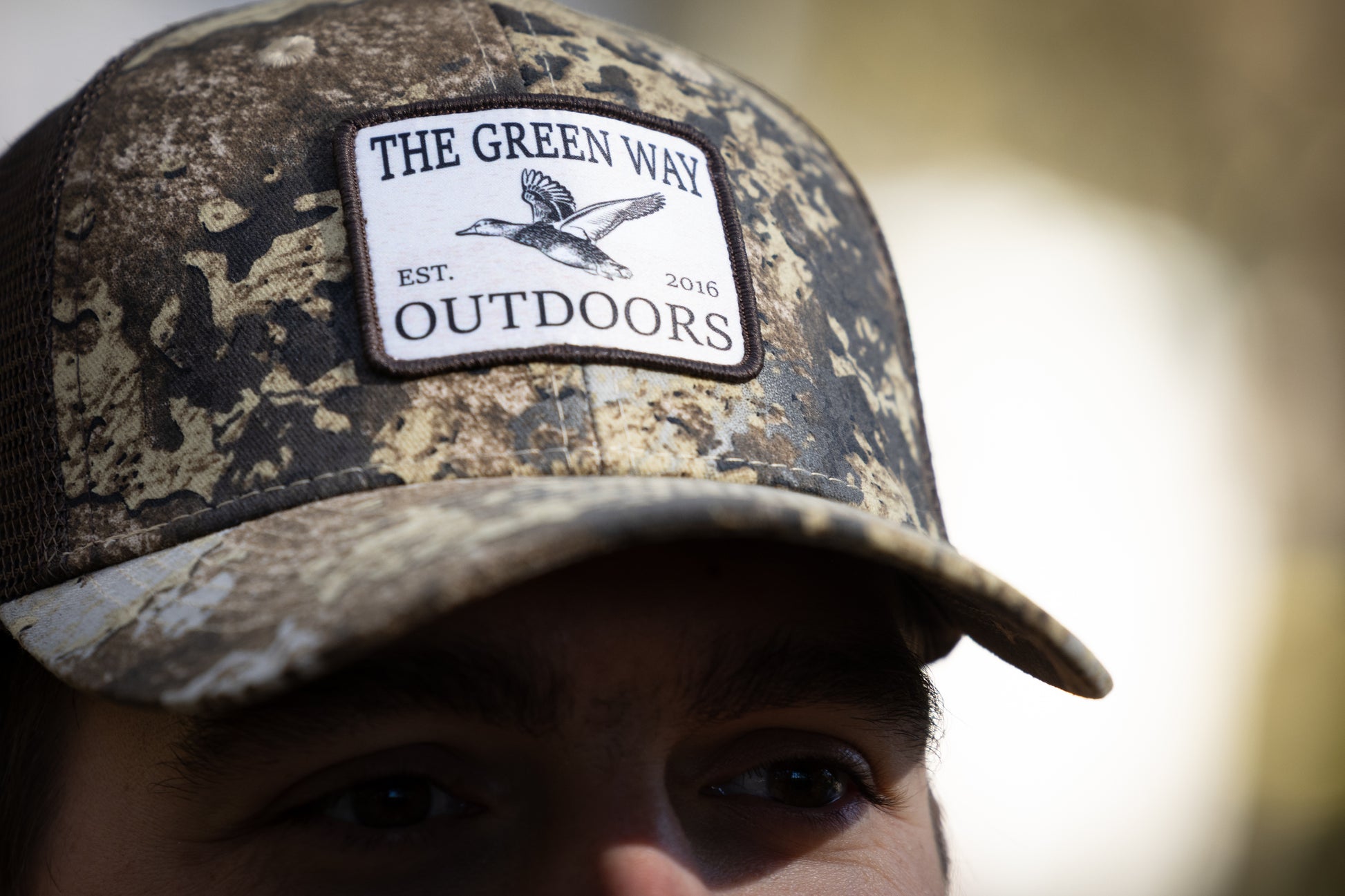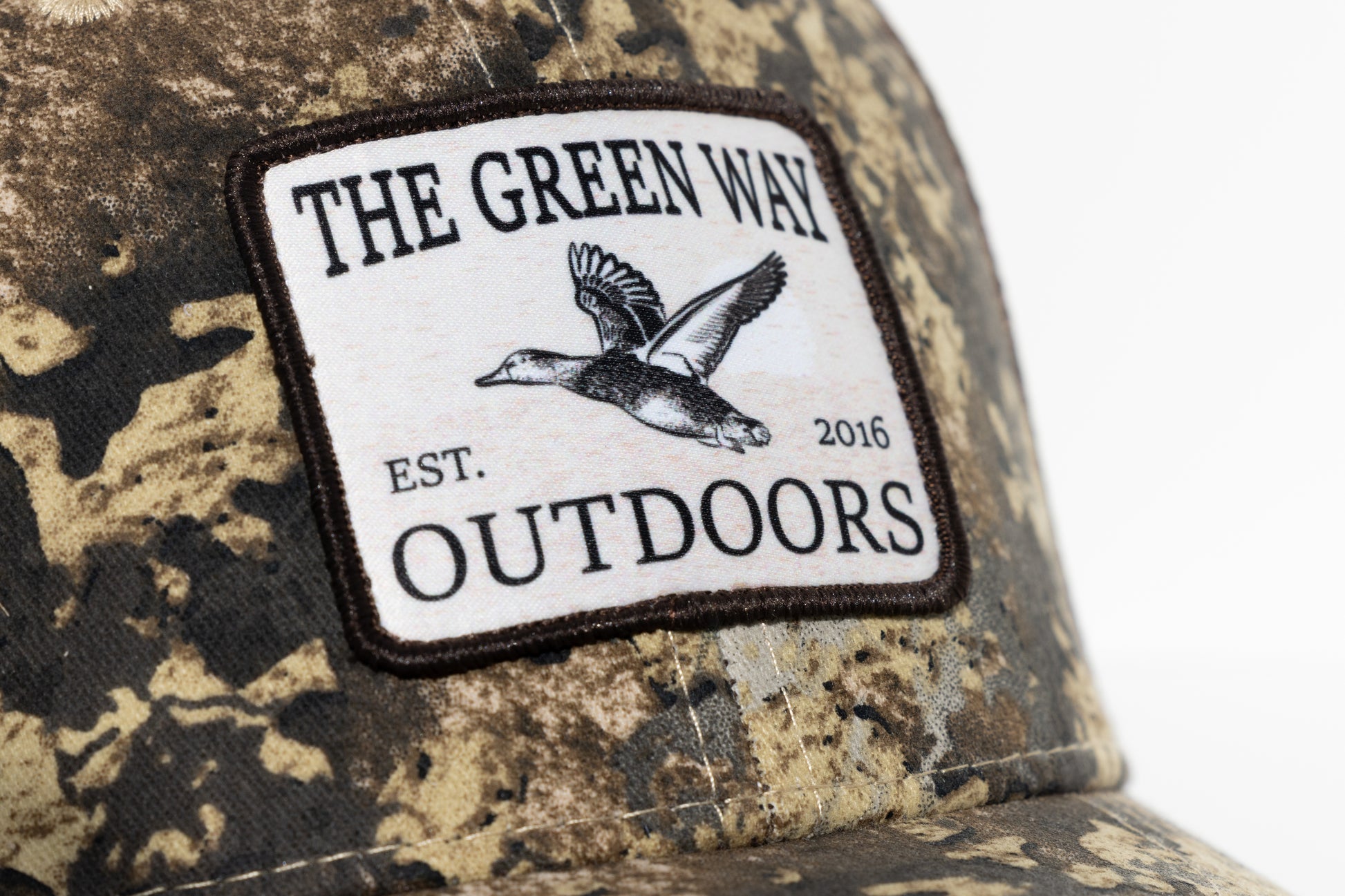 A 6-panel hat featuring True Timber Prairie camo and a TGWO duck patch, breathable mesh back, precurved visor, and adjustable snapback. One size fits most.
